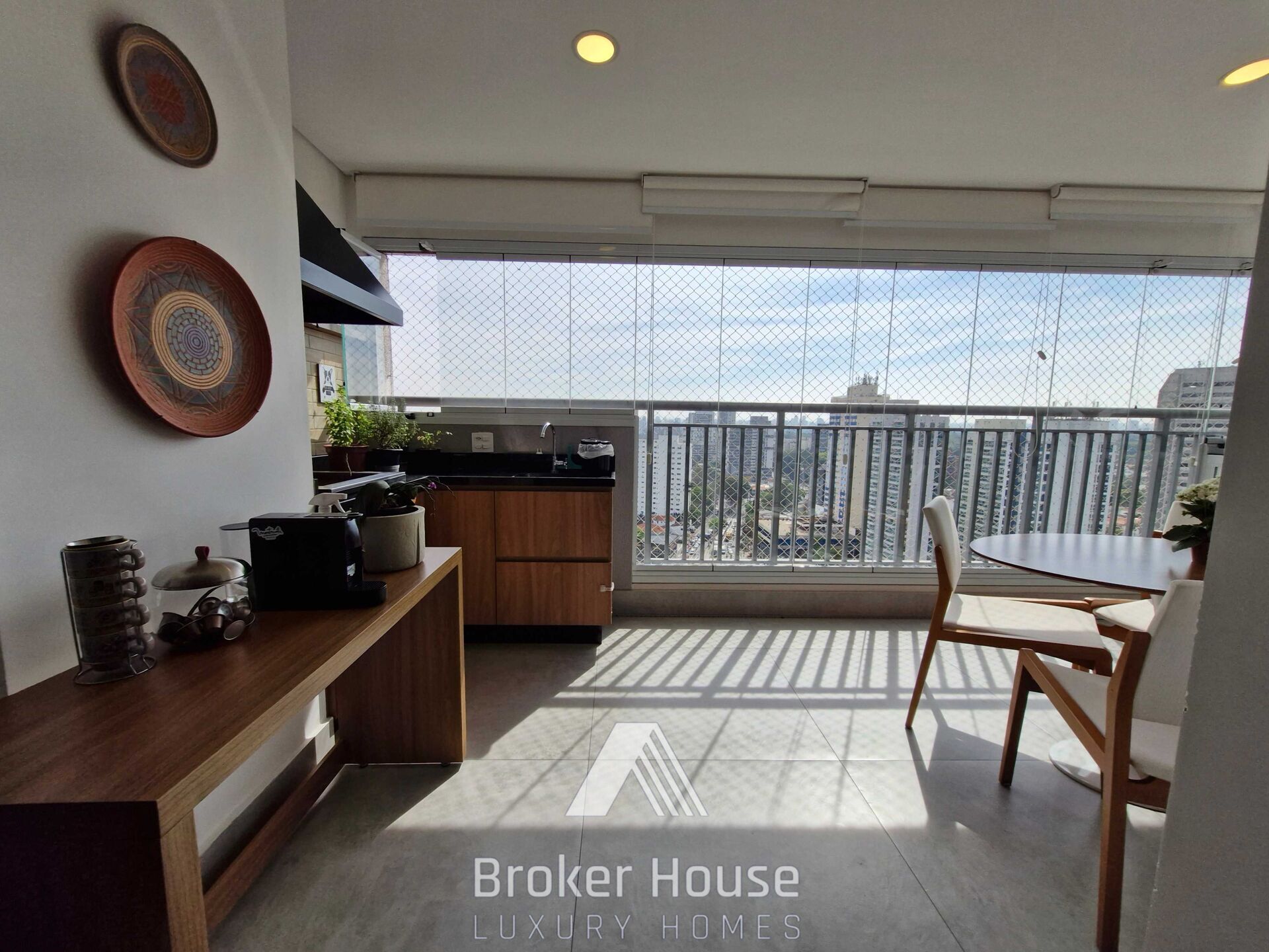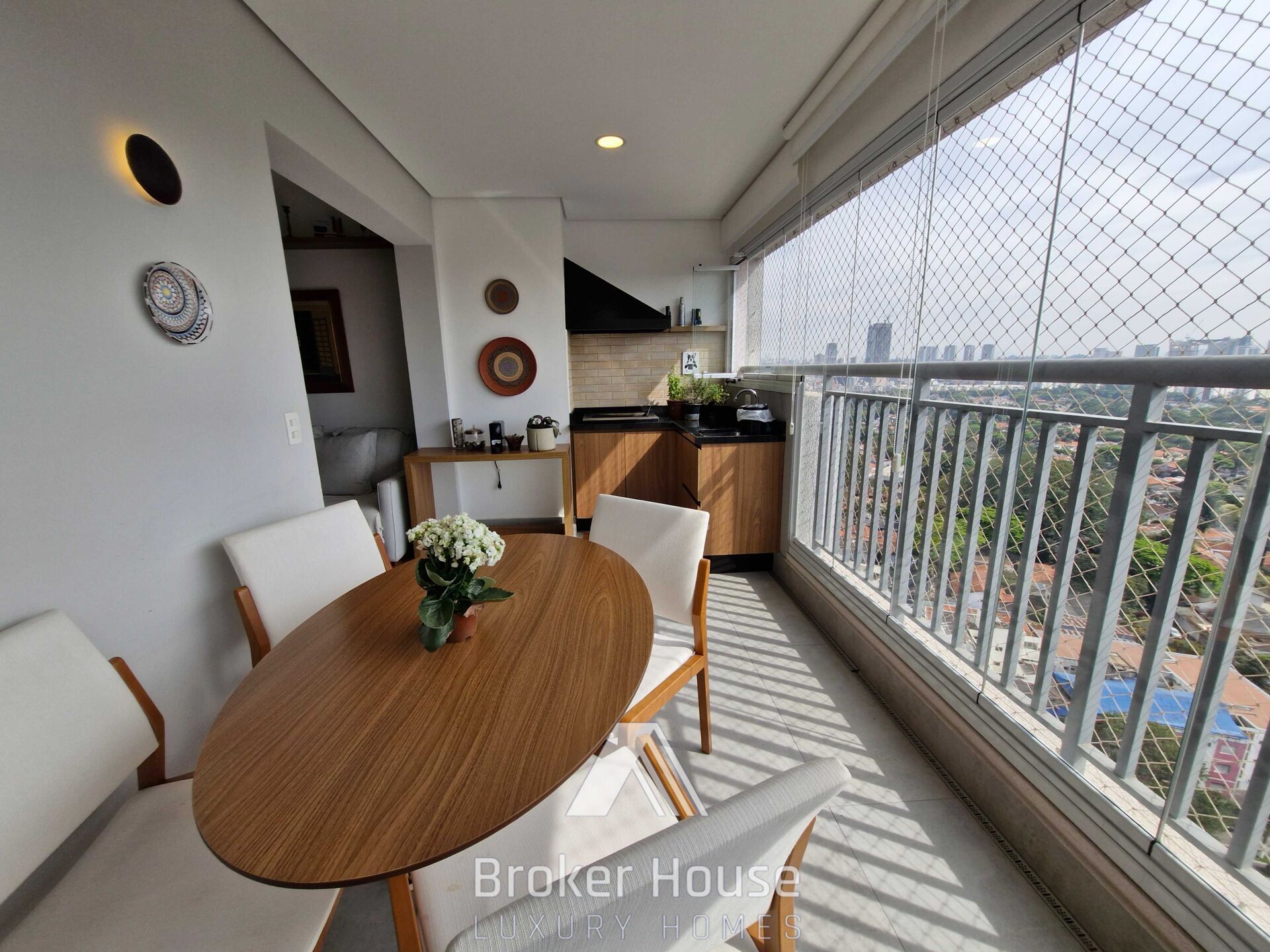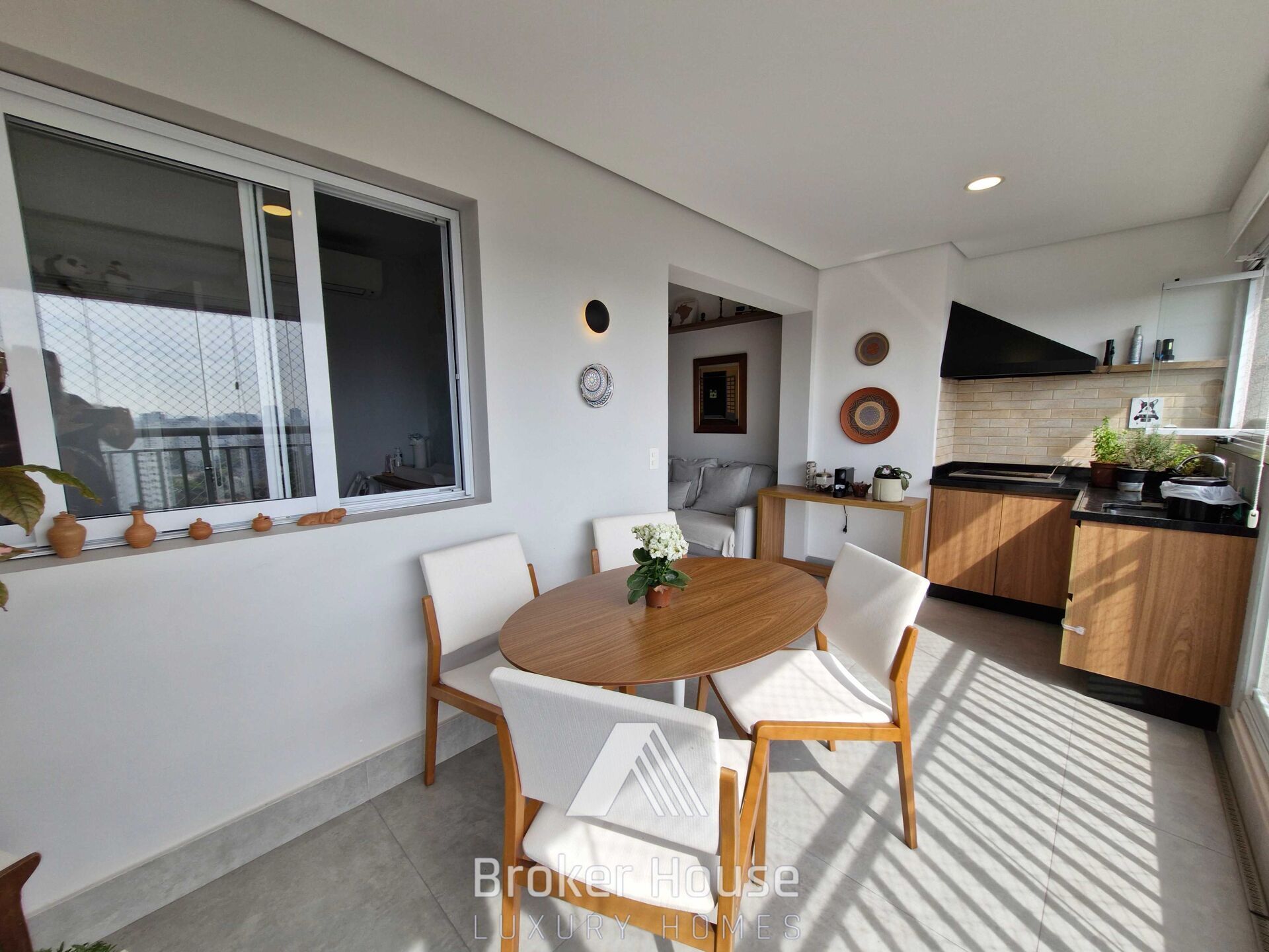 Sala de estar, sala de jantar integradas com varanda gourmet, que conta com churrasqueira a carvão. Cozinha americana repleta de armários