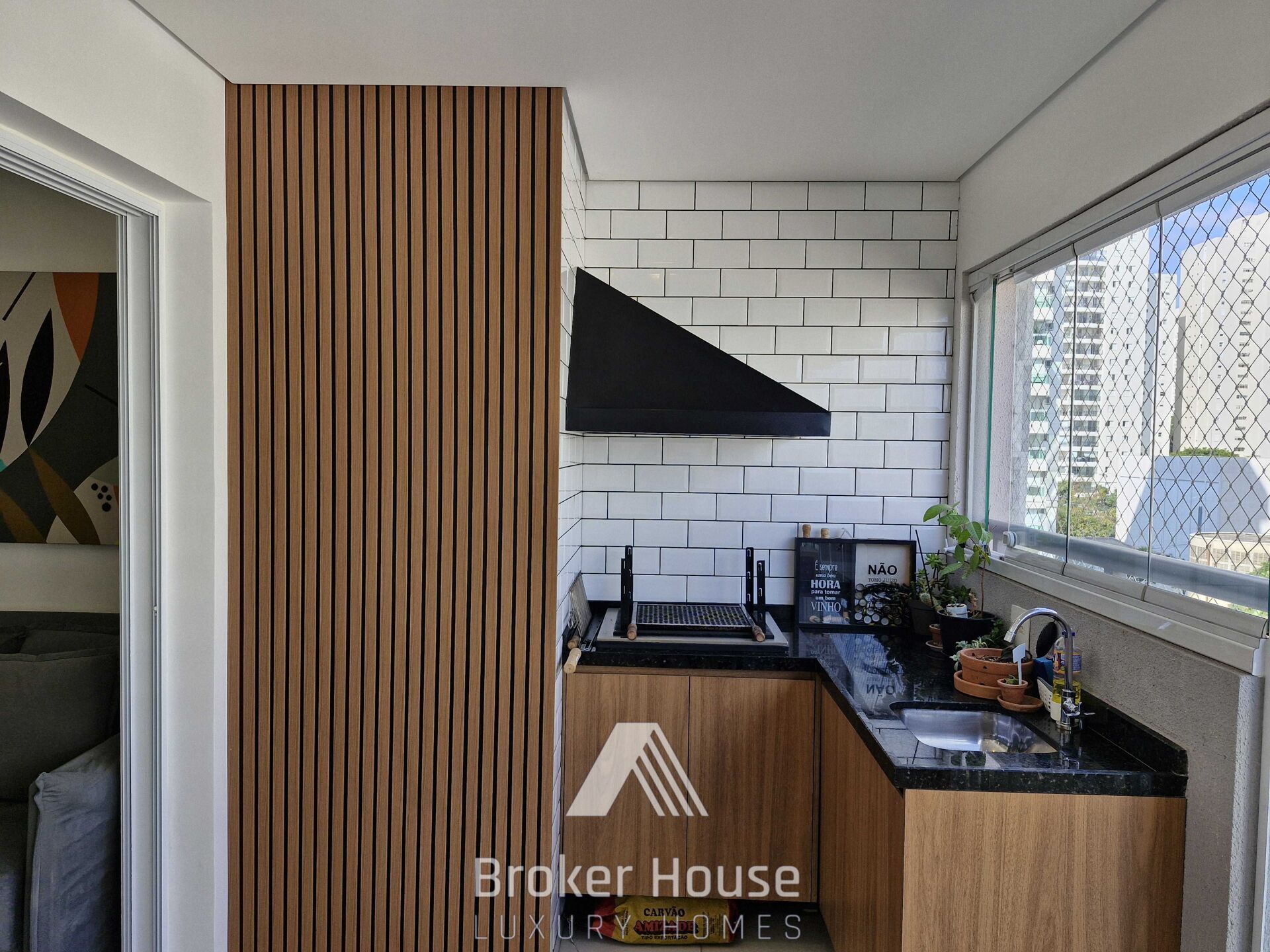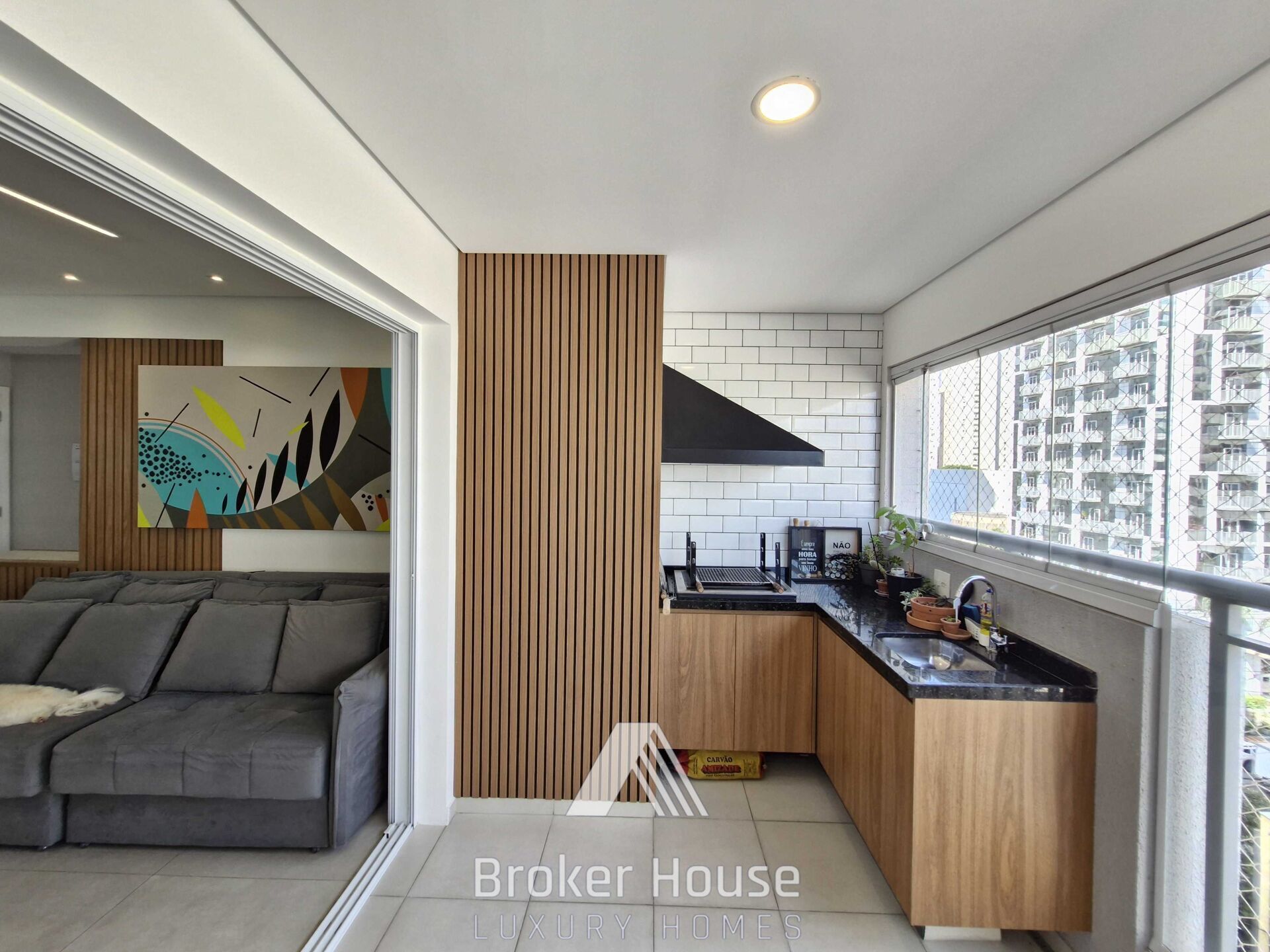 Varanda gourmet com churrasqueira à carvão, sala de estar e sala de jantar integradas, lavabo, cozinha americana integrada com área de serviço.