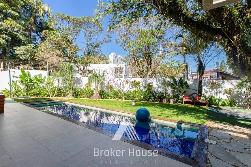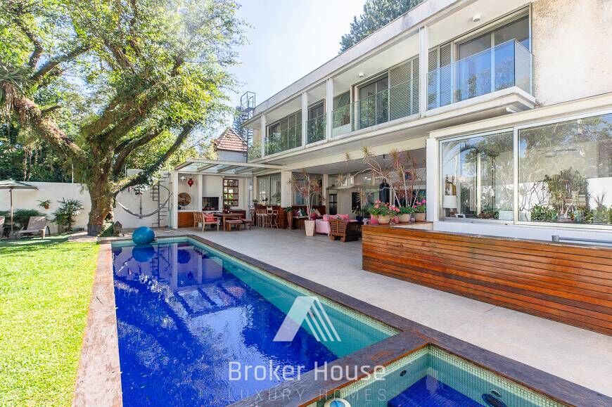 A casa tem ampla área externa com um amplo jardim, espaço gourmet, piscina, sauna e mini quadra esportiva, além de um redário sob uma árvore secular. Na parte interna, seu pé direito duplo oferece uma sensação ainda mais gostosa de amplitude. No piso térreo temos: sala de jantar e estar com lareira, escritório, lavabo, cozinha com despensa, lavandeira e mais uma charmosa suíte com vista para o Jardim de Inverno. No piso superior são quatro dormitórios, sendo duas suítes tradicionais, a máster com hidro e terraço, e dois dormitórios com banheiro conjugado (suíte americana), podendo um deles ser usado como sala de TV ou quarto de hóspedes. Todos os quartos tem portas triplas: vidro, veneziana e mosqueteiro e todas elas abrem para uma varanda conjugada com vista para a piscina, na suíte máster os armários são Ornare. Toda a casa é revestida por assoalho de madeira Cumaru. Possui entrada social e de serviço, garagem para dois carros e depósito. Abastecimento à gás, água quente em todas as torneiras, incluindo cozinha e lavanderia. Cisterna com água da chuva com capacidade pra 5 mil litros. Acabamento externo em Fulget. Portas e janelas com esquadrias em alumínio com folhas que se juntam integrando totalmente os ambientes. Diferencial: 3o andar com possibilidade de ser um solarium, rooftop ou o que sua imaginação desejar!