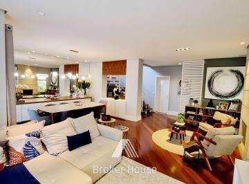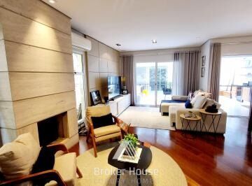 Living para 2 ambientes e com lareira, espaço gourmet com churrasqueira, jacuzzi para 6 pessoas e jardim. 3 suítes, escritório, cozinha planejada. 2 lavabos. Dependência de serviço. 3 vagas de garagem.