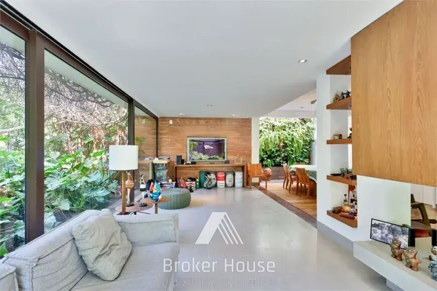 Amplo living, com vista para um jardim exuberante, lavabo. São 4 dormitórios, sendo 2 suítes, uma master com closet, e uma suíte na área externa para hóspedes. Home office.