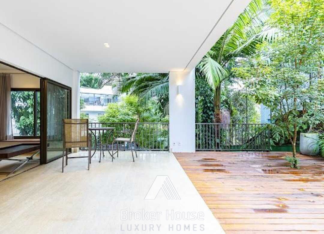 O interior da casa é composto por amplas salas de estar e jantar, com pé direito alto e grandes janelas que garantem integração com área externa proporcionando, luminosidade natural e uma vista espetacular para o jardim.
